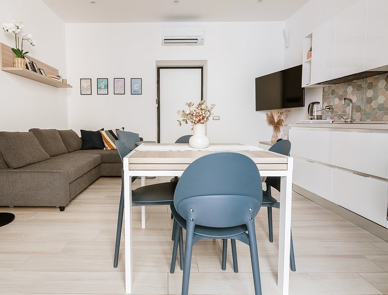 Welcome to our exquisite apartment with blue details, located in the vibrant center of Naples. This refined space, enhanced by a palette of sophisticated blues, instills a sense of serenity and freshness, accompanied by all the modern comforts you could desire.