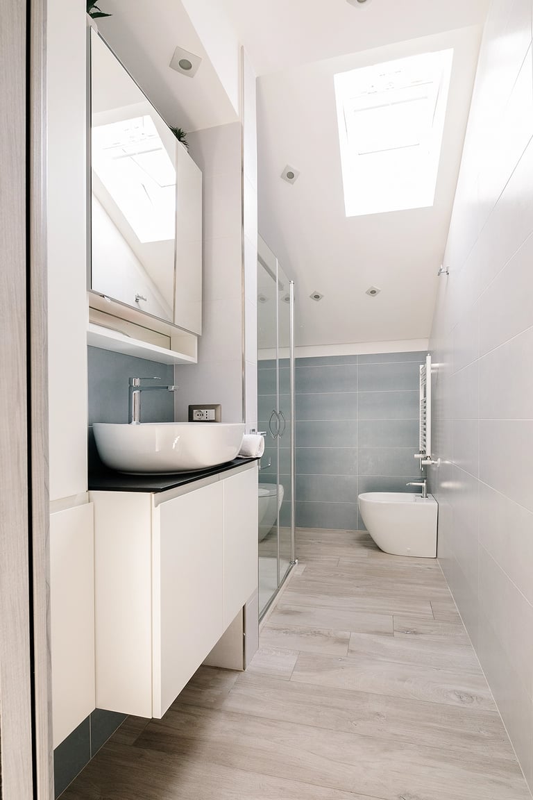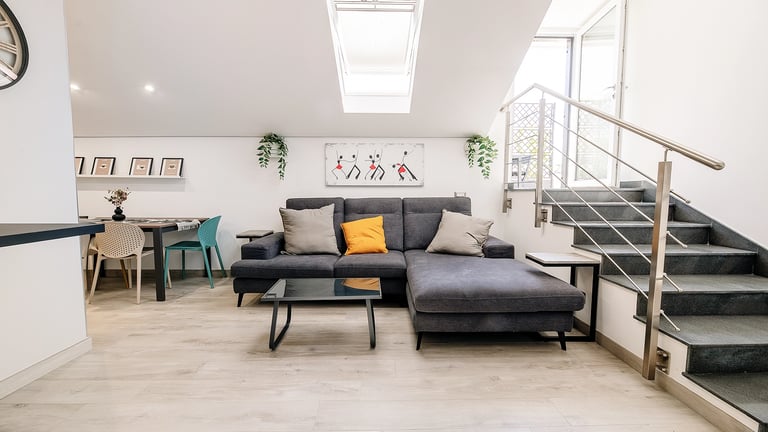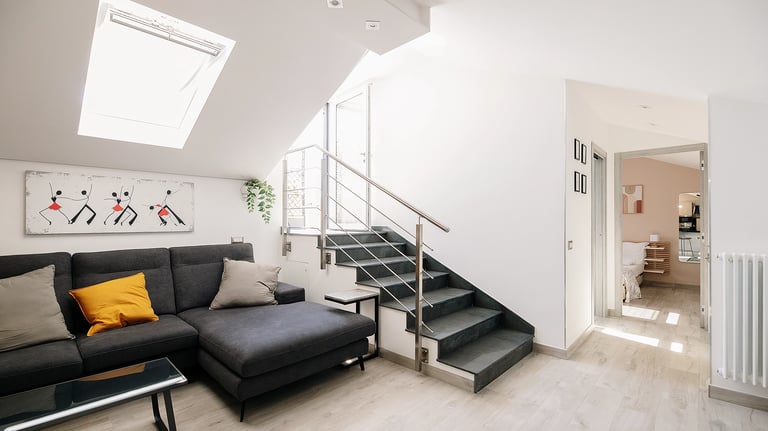 L' appartamento è dotato di lucernari Velux, con controllo a distanza e serrande elettriche, che permettono di regolare la luce naturale e creare l’atmosfera ideale in ogni momento della giornata.