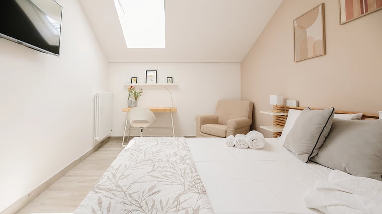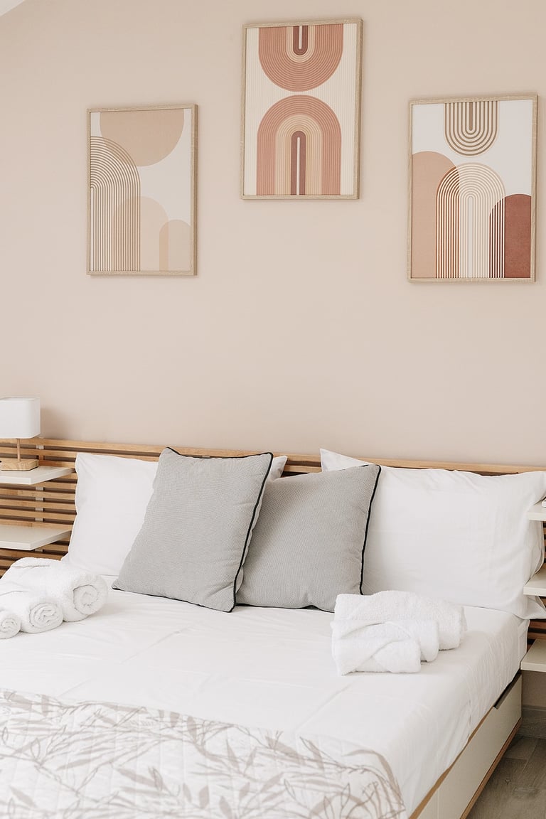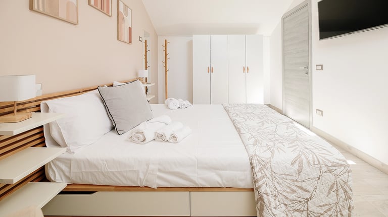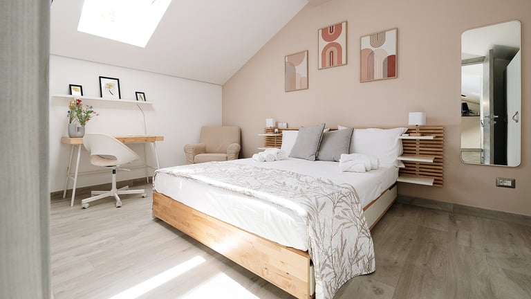 La camera da letto, in stile moderno, è un rifugio accogliente e ben arredato, caratterizzata da colori tenui che creano un'atmosfera serena e rilassante.